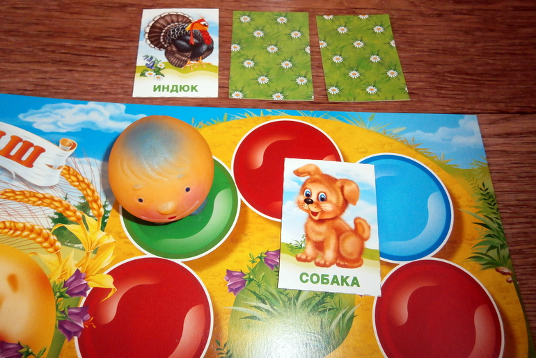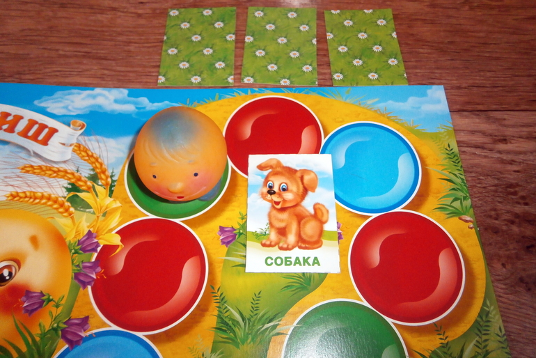Игра для 2-4 игроков в возрасте +3. Игра состоит из игрового поля, 4 колобков, 48 карточек, кубик. Кубик и фишки сделаны из резины.