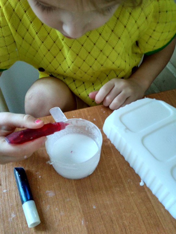 Увлекательнее всего для дочки было смешивать красители и получать новые цвета, ведь красителей всего 3 - красный, синий и жёлтый. А нам нужен и зелёный и фиолетовый.