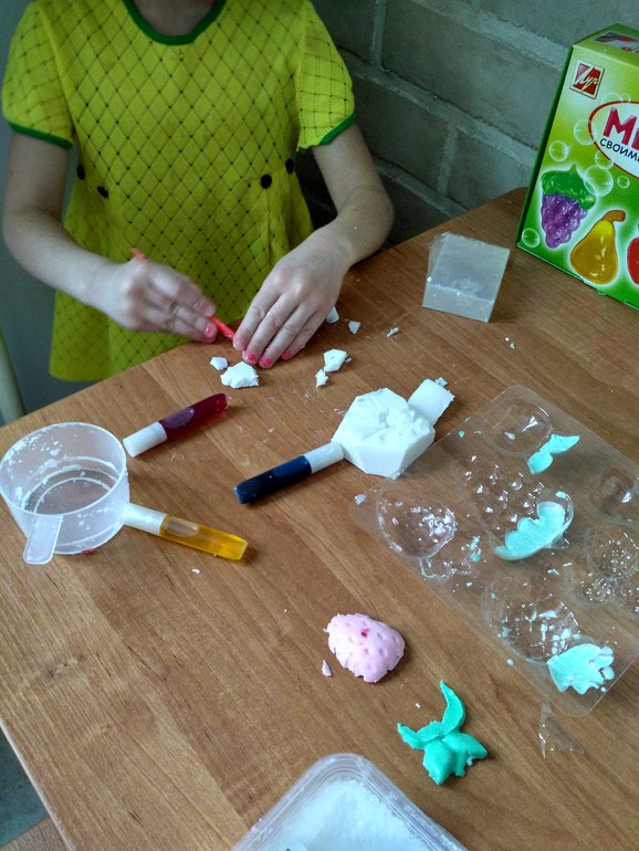 Сам процесс простой - нужно порезать стеком мыльную основу на небольшие кусочки, поместить в стакан и стакан нагреть в микроволновке секунд 20-30. Вот Аня режет: