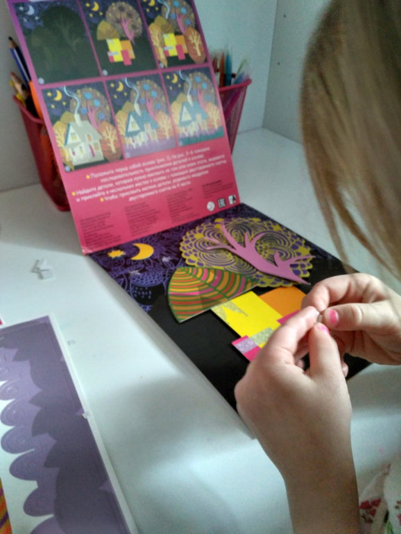 Процесс не сложный, на кубики двойного скотча нужно приклеить детали. Детали нужно выдавливать, так что дочь самостоятельно с этим справлялась. Последовательность на схеме есть.