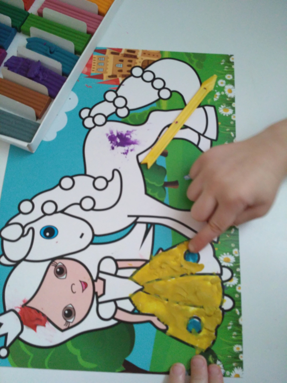 Вот процесс смешивания и получения именно нужного оттенка Аню очень захватил! ! ! Ведь это действительно интересно. Пластилин меняется на глазах и ребёнок оценивает такой ли оттенок получился, что важно для лица принцессы. Если не такой нужно подумать и добавить ещё немного какого-то цвета.
