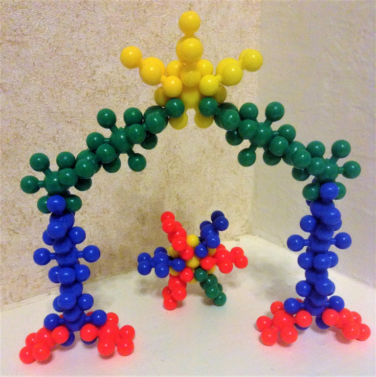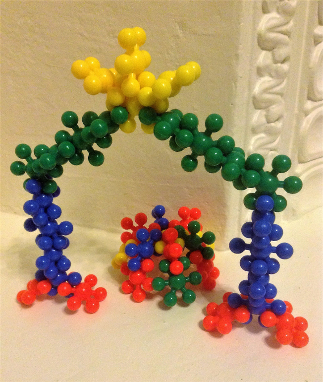 Второй конструктор - "Снежинки", взяла 2 набора, т.к. в одном 20-22 шт , по 5-6 деталей каждого цвета. Для больших построек можно и больше взять. Одна снежинка оказалась с 5-ю лучиками, но тоже идёт в дело. При покупке проверьте, конструктор в прозрачном пакете. Размер снежинки 4 см, диаметр шарика 1 см ,на ощупь гладкие, в руках держать приятно, соединения держатся плотно, Вика в свои 5,9 справляется, деткам помладше будет трудно соединить-разъединить. Здесь то ли арка, то ли начало строительства избушки на курьих ножках :))