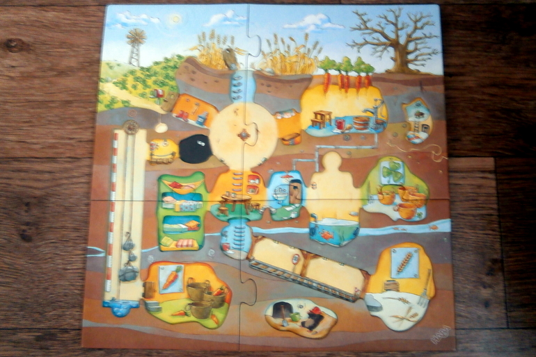Игра для 2-4 игроков, возраст +4. Состоит из игрового поля (1 лифт, 1 колесо, 1 гондола, 1 вагончик), кубика, 4 хомячков, 1 ежика, 12 фишек с едой ( 4 фишки с пшеницей, 4 фишки с клевером, 4 фишки с морковкой), 14 фишек с листьями.