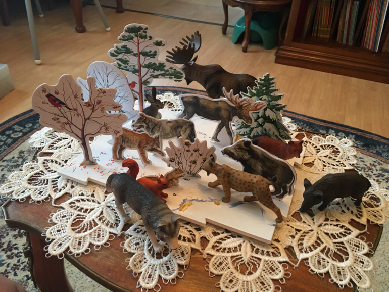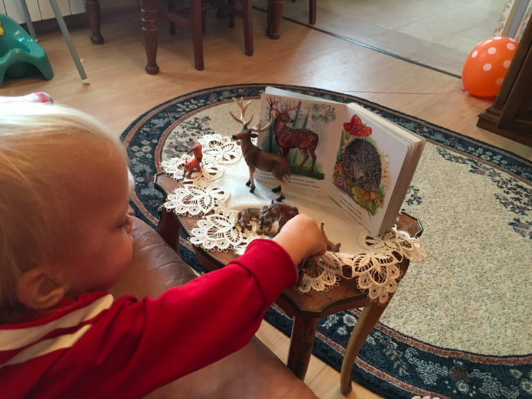 По мере взросления "росли" наши книжки. Долгое время читали картонку Олеси Квитко Дикие звери, и, конечно, не смогли обойтись без наших любимых фигурок. Подобрали абсолютно всех персонажей! Обыгрывались их повадки, жилища, пищу и т.д.