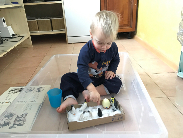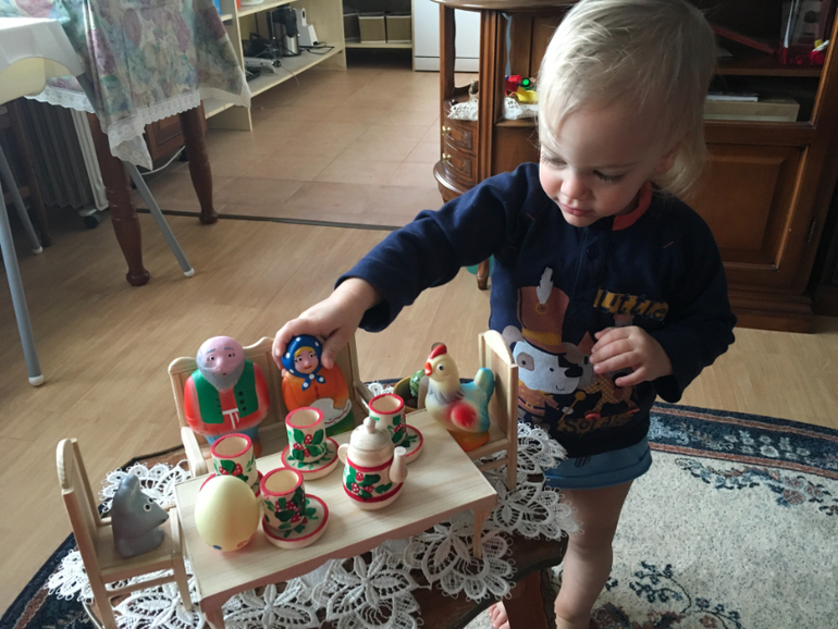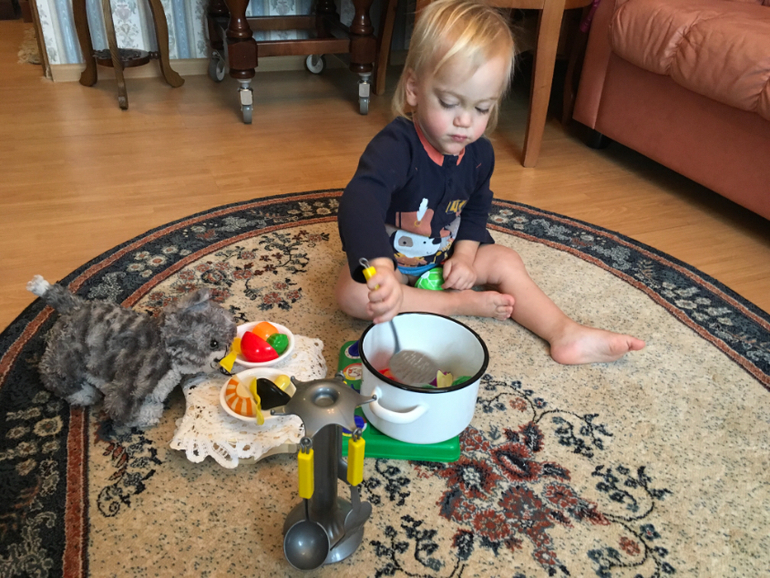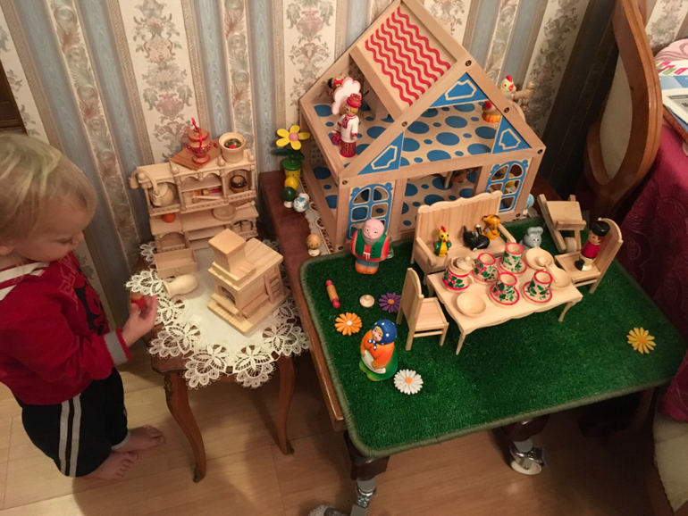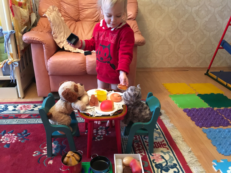 Помимо разыгрывания книжных сюжетов, играем, естественно , в сюжетно-ролевые игры. Кормим, поим, купаем, катаем, спасаем от хищников, ищем маму, строим жилища и т.д.