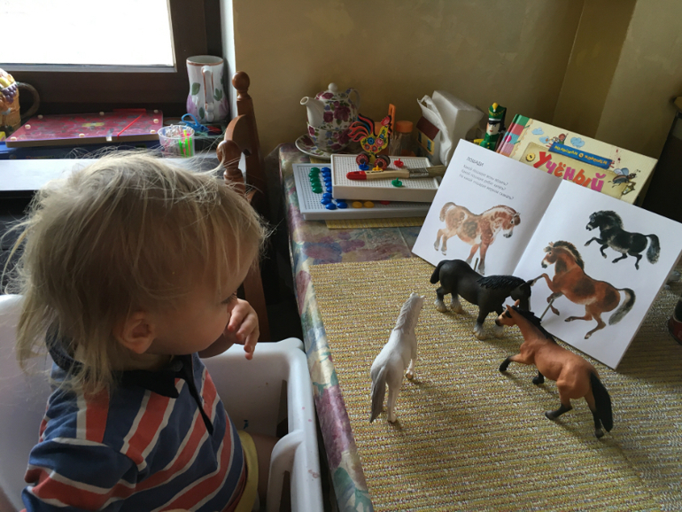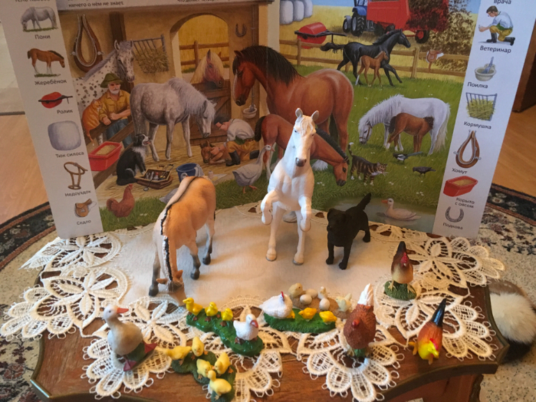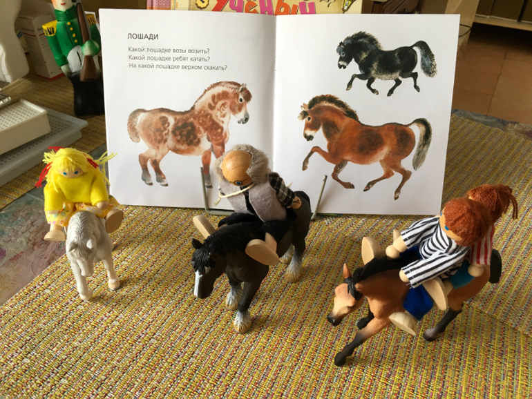Через какое-то время мы переключились на другую серию книг от издательства Улыбка. Играли тоже с большим увлечением и восторгом. Подбирали фигурки к каждой страничке, даже породы лошадей находили такие же, ну и изучали по ходу дела.