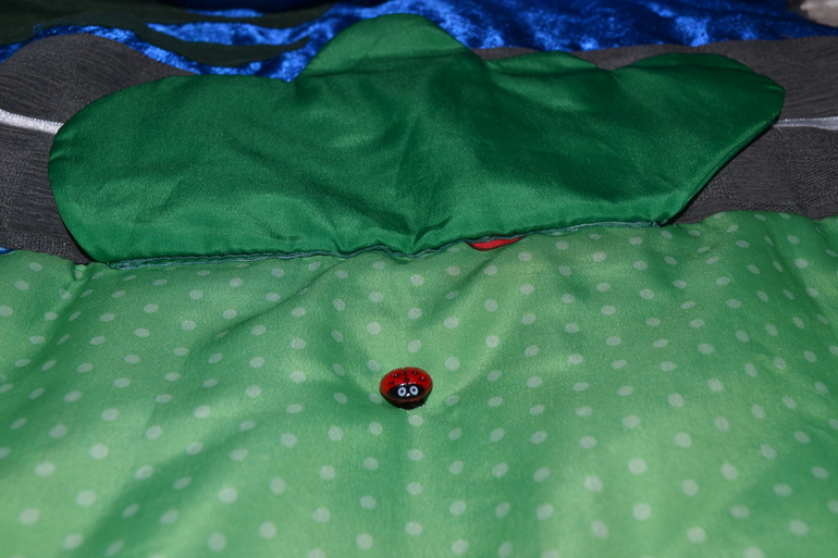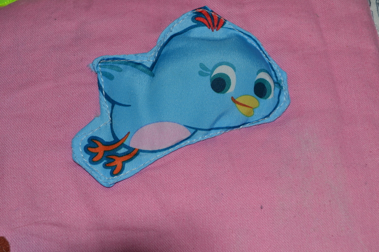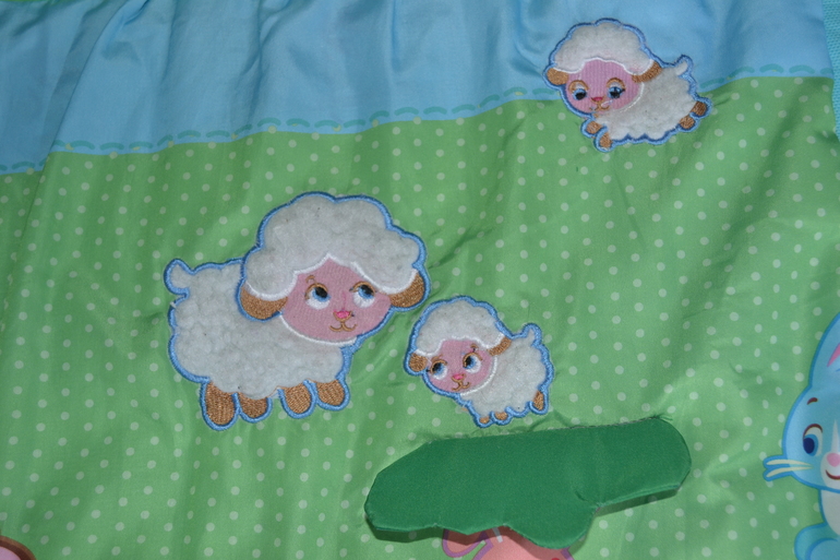 Сначала наваяла эскиз будущего коврика на бумаге. Поделила сценки на квадраты. Продумала какая ткань к какой сценке подойдет. Начала шить каждый квадрат. Во время самого процесса, додумывала и докупала более мелочные детальки (на какую сценку лучше пришить божью коровку, куда лучше бабочку, птичку и т.д.) Затем сшила квадраты друг с другом, начиная с середины, т.к. квадрат посередине самый большой. Потом пришила всё к основанию, т.е. к одеялу. Одеяло пришлось чуть подрезать, подогнать по размеру. Края прошила широкой салатовой лентой.