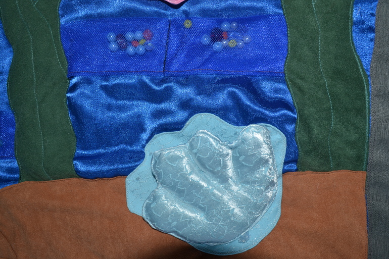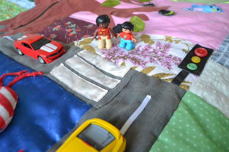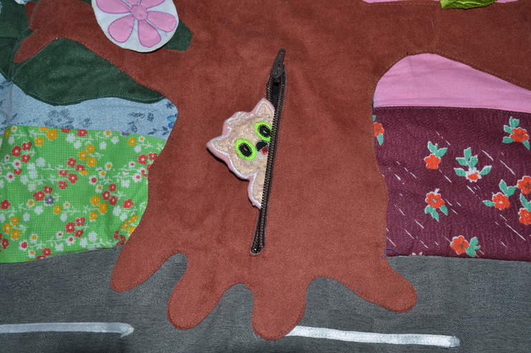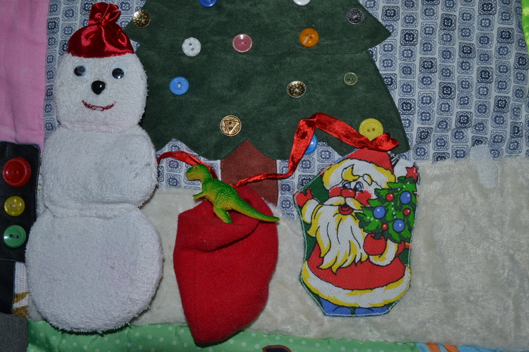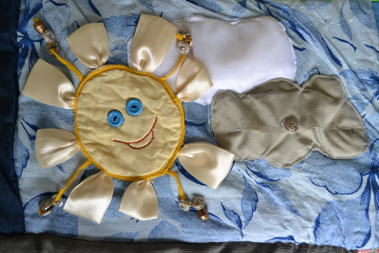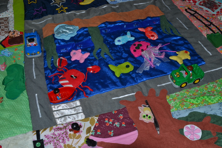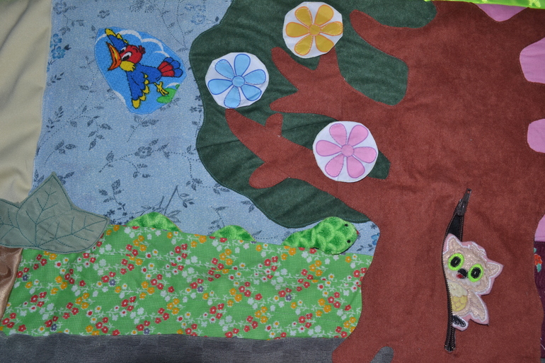 У коврика множество разнообразных по форме, цвету и фактуре деталей, выполненных из разных материалов и тканей (хлопок, фетр, вискоза, бархат, кожа, полиэстр, джинса, микрофибра, махровая ткань), что лучше помогает малышу совершенствовать тактильную чувствительность пальчиков. Когда малыш общупывает коврик, я проговариваю его ощущения: гладкий, ворсистый, пушистый, скользкий, шершавый, мягкий, теплый, холодный, жесткий и т.д. -- в соответствии с осязаемой фактурой материала.