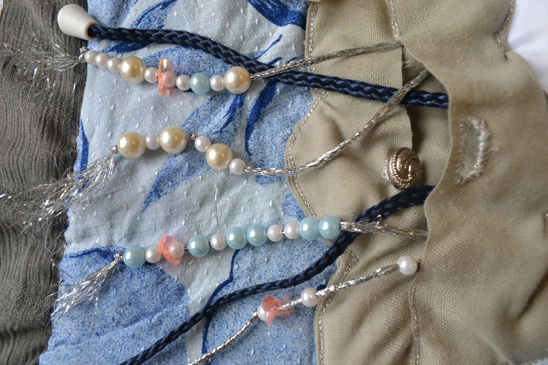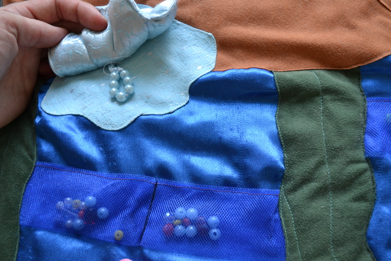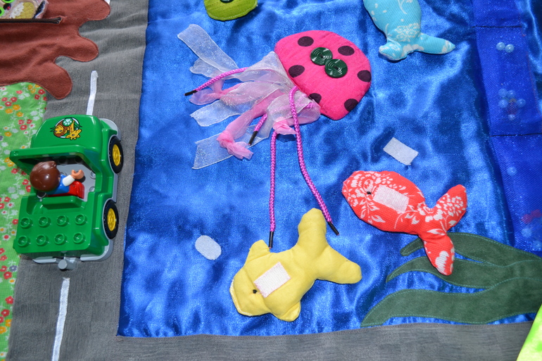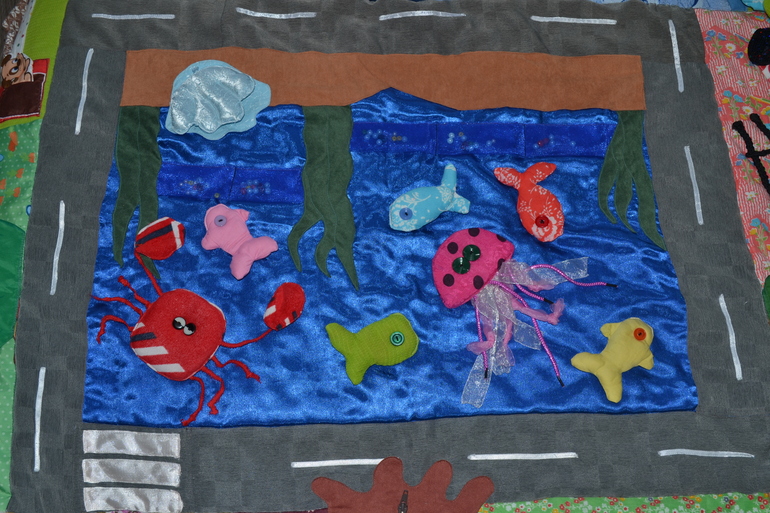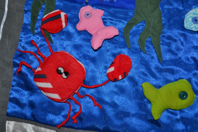 По середине море с его обитателями. Шесть разноцветных рыбок, медуза с хвостиком из ленточек и шнурков, внутри краба шуршащий пакет. Всё на липучках. Ракушка открывается, внутри жемчужинки.