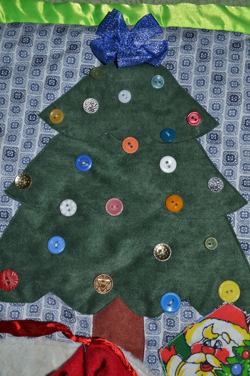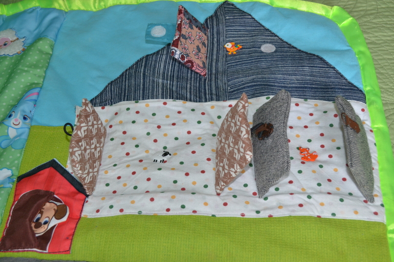 Следующая композиция была взята из другого малюсенького развивающего коврика, который подарили в магазине по акции. Я его разобрала, он мне не нравился. Барашки из приятной мягкой флисовой ткани. Кустики на ощупь шуршащие.