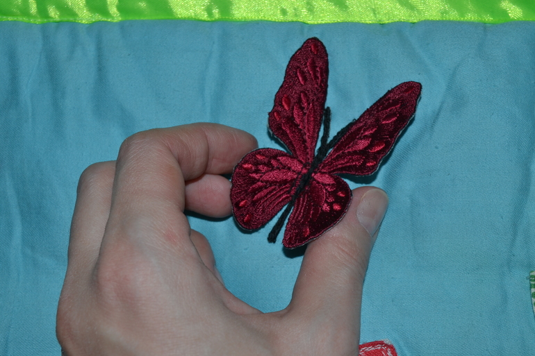Цветок с лепестками из разных по фактуре тканей: голубой шуршит (в нем пакетик), розовый просто пушистый, на оранжевом бусинка, в красном большие три бусины, в желтом пуговки, а на синем и зеленом сидят бабочки. Посередине зеркальный пластмассовый материал:
