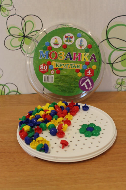 Покажу мозаику из Fix Price. Хорошие шестигранные маленькие детальки, круглое пластмассовое поле. Вижу в ней несколько недостатков: очень легко крышка открывается, не удобно ее хранить, чуть что рассыпается и деталей меньше, чем дырочек в кругу. Если купить две этих мозаики деталей станет достаточно и играть будет, на мой взгляд интереснее. Но за такую цену все же очень приличная мозаика! Маше она нравится, часто достает ее и играет.