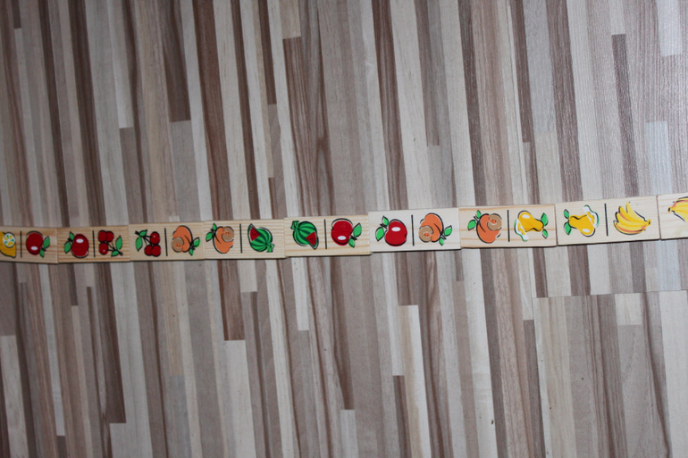 Домино "Томик". С удовольствием играет, но пока только в одну сторону, то есть ищет пару к фрукту, который находится справа, но по- моему, это уже хорошо))