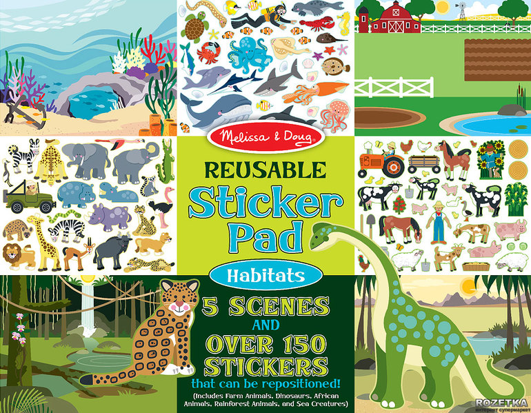 Альбом многоразовых"наклеек" Мелисса и Даг. Это не наклейки, животные сделаны из винила (если не ошибаюсь) и с легкосттю крепятся к поверхности, здесь большое поле для детской фантазии. У нас еще есть альбом с транспортом. Купила давно, когда Ярик только родился))) и вот он, наконец, дорос до них))ура)))