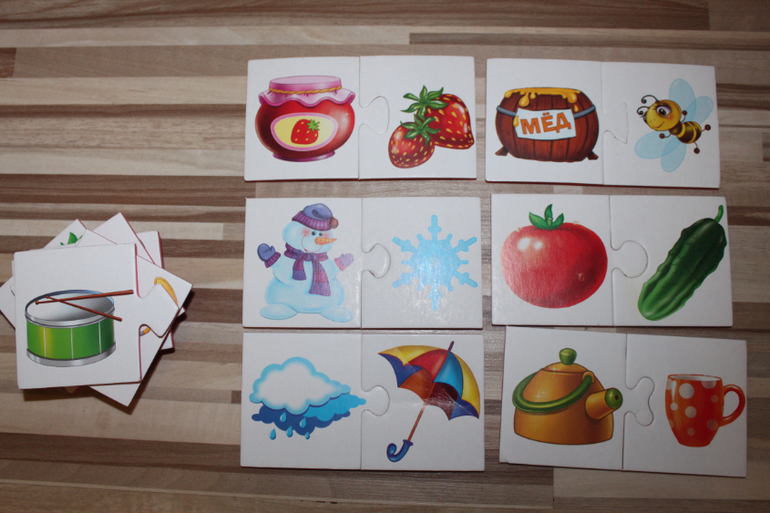 Игра "Половинки", пока не все получается, здесь нужно соотносить понятия, не всегда он правильно может это сделать. Легко скрепляет огурец и помидор, пчелу и мед, варенье и ягоды, снежинку и снеговика и т.п, но , например, музыкальные инструменты пока сложно.