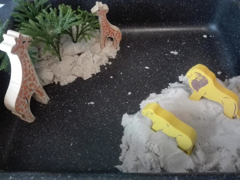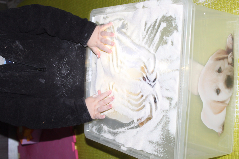 В коробке фонарик, а на крышку рассыпали манку, рисовали разные узоры в темноте))) очень понравилось)))