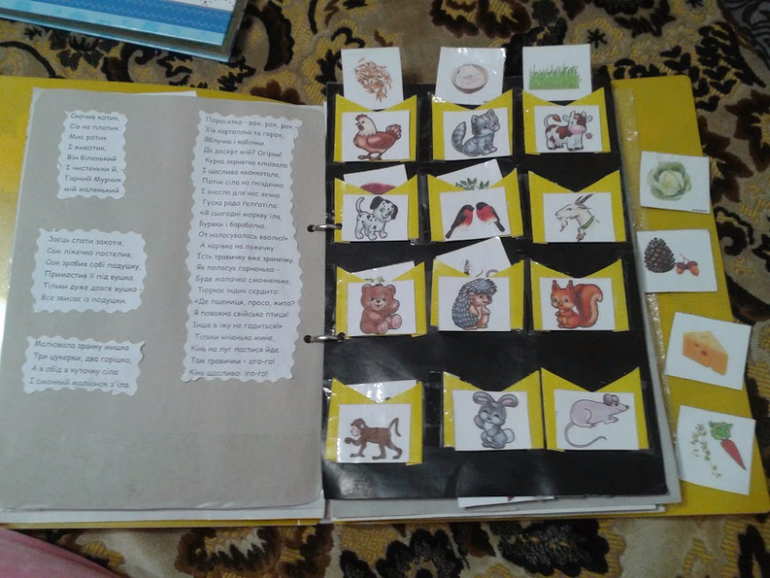 Страница 4 - чей малыш. Нарисованы зверята мамы, открываешь , а в окошке зверята детки и стишок про мам и их деток. Страница 5 - из чего варят компот , а из чего борщ, просто сортируем карточки с овощами и фруктами
