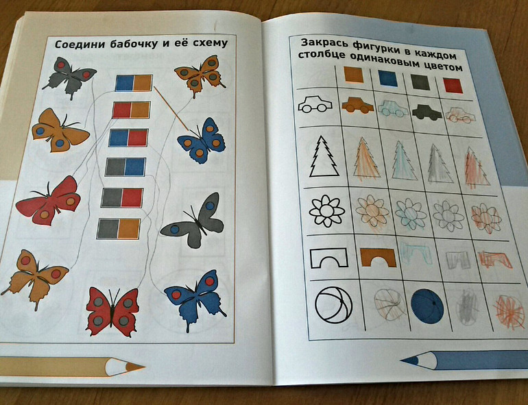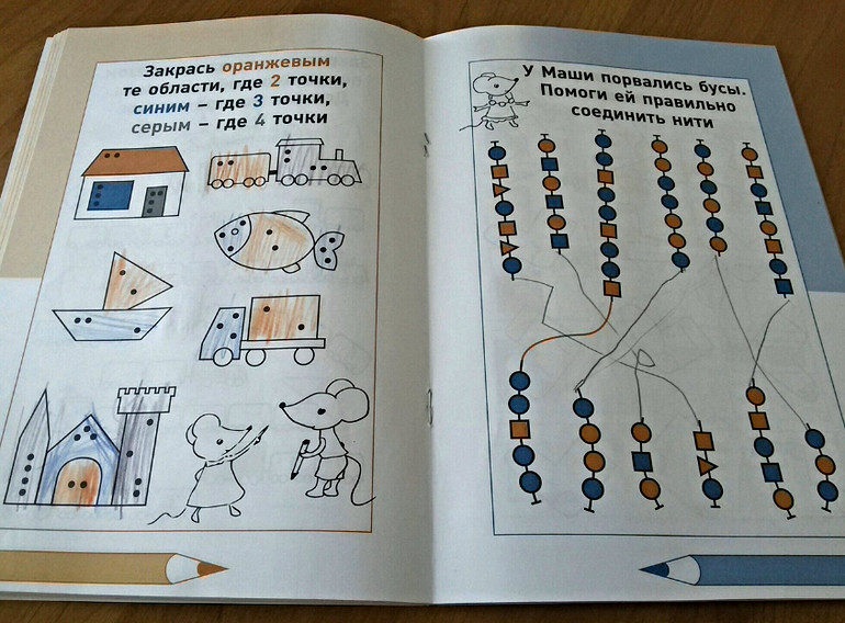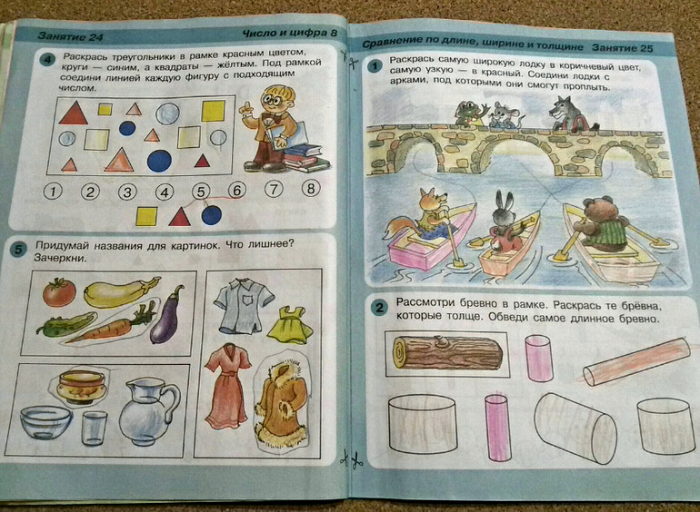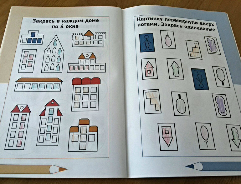 Сборник толстый, целых 80 страниц. Тематика заданий очень разная, периодически она повторяется в немного измененном виде. Если раньше мы соединяла по цветам руки с кольцами, то теперь подбираем кубикам подходящие домики.