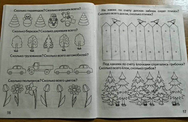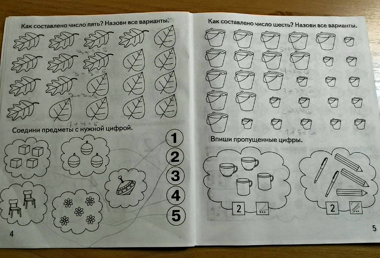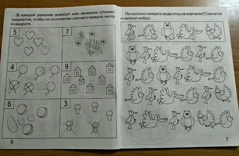 С упражнениями в первой части тетради четырехлетка справляется хорошо. Их можно разделить на два типа. В одних нужно посчитать предметы и написать соответствующую цифру. В других нужно дорисовать или зачеркнуть предметы, чтобы их итоговое количество соответствовало указанной цифре. Дочка быстро поняла принцип и решала задания уже самостоятельно.