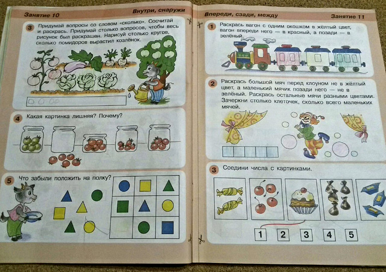 В "Игралочке" тридцать два занятия, включая повторение пройденного материала. В конце размещены методические рекомендации к каждому уроку по заданиям. Но все упражнения понятны и без авторских комментариев. Единственное с чем мы не сразу разобрались - задания, в которых нужно найти лишний предмет. Мы пытались определить один, а оказалось, надо объяснить, почему каждый предмет в ряду может быть лишним.