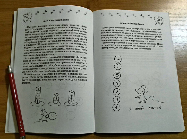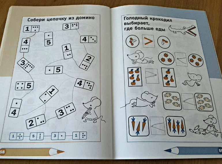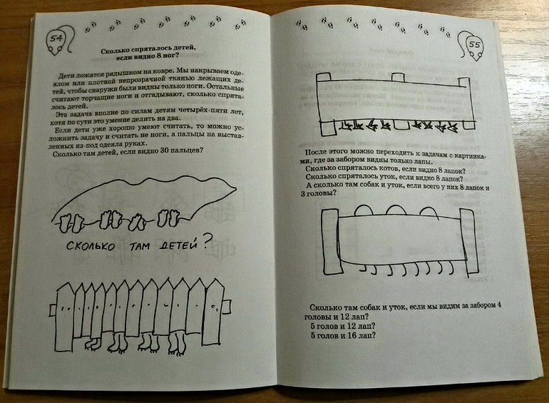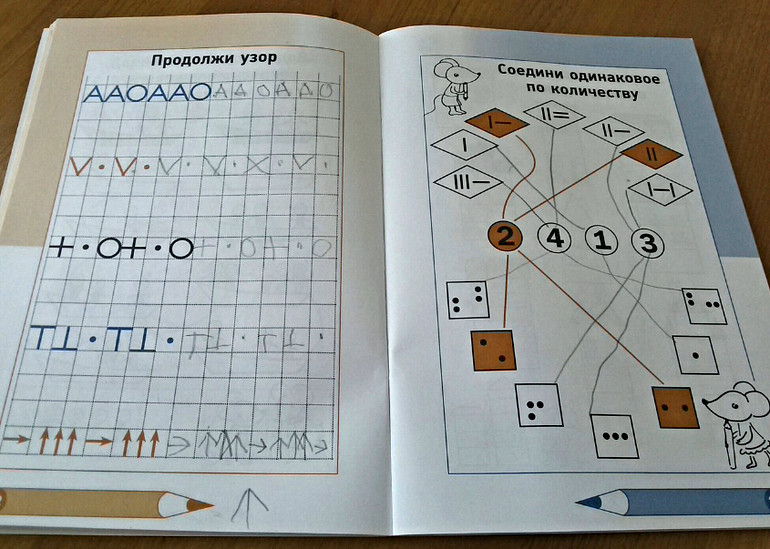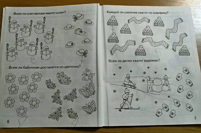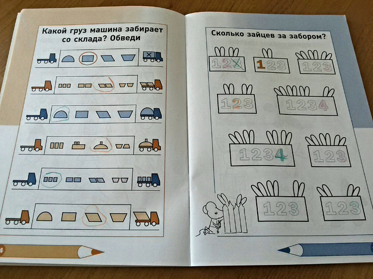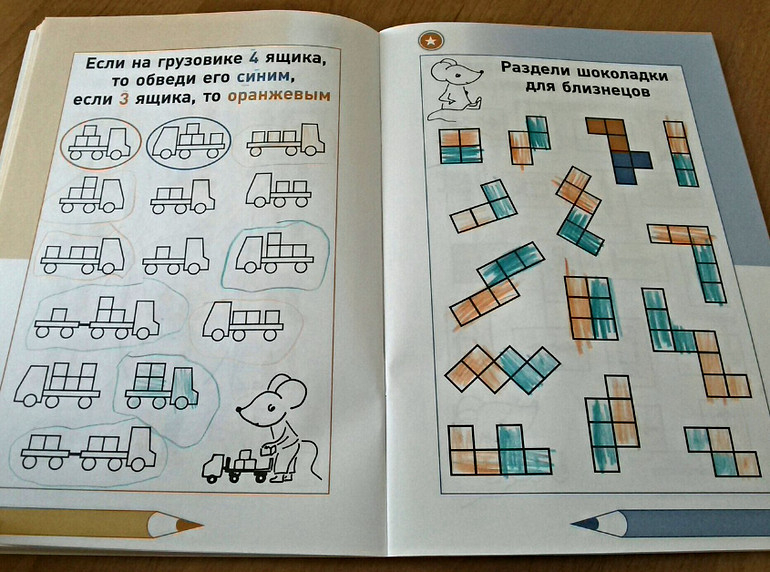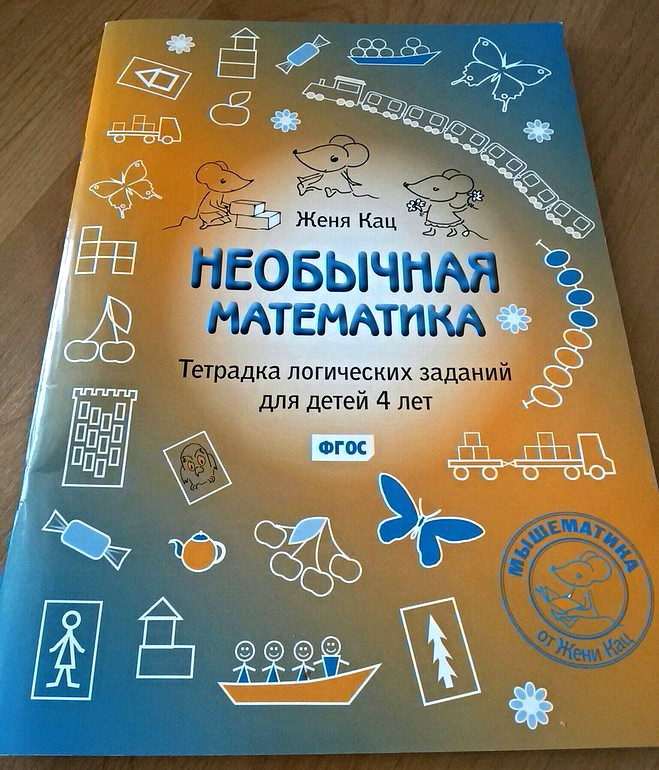 Очень хвалят эту тетрадку логических заданий от Жени Кац. Пожалуй, я присоединюсь к этим отзывам. Но будьте внимательны, здесь нет примеров, да и цифры нужно писать только в нескольких заданиях. Зато это целый кладезь для развития мышления.Некоторые упражнения я нигде раньше не встречала. Например, разделить на детали домино или определить по ушам, сколько кроликов спряталось за забором. А над заданиями с палочками, когда нужно определить какую деталь переложили или убрали дочка изрядно поломала голову. Сначала строила фигуры из карандашей, перекладывала, сверяла, а к концу тетради уже на глаз все определяла.