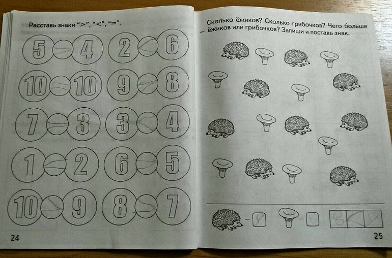 Дочка эти понятия освоила быстро и уверенной рукой расставляла знаки < > и =. Она сразу запомнила, что где широкий край там больше, где узкий - там меньше. После такого количества упражнений это доведено уже до автоматизма.