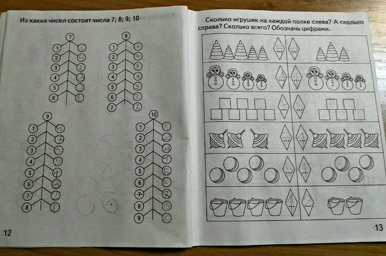 "Состав числа" пока последняя решенная тетрадка в этой серии. Сейчас мы закрепляем полученные знания по тетрадям из другой серии, но к этой потом обязательно вернемся. Задача этого пособия помочь ребенку усвоить знания о составе числа из единиц, научить самостоятельно составлять числа из разных чисел. Для меня оно было самое нудное и поначалу совершенно однообразное. В нем показаны все варианты составления чисел от 1 до 10. Ребенку конечно очень наглядно, а мама от скуки объясняла сразу на примерах сложения. Дальше ребенок должен самостоятельно вписать все возможные варианты составления чисел. Благо хватило одного разъяснения и дальше дочка долго пыхтела сама, раскладывая из карандашей всевозможные комбинации.Во второй половине дело пошло веселей. Началась активная отработка состава числа, параллельно уже можно объяснять принципы сложения и вычитания. Ну и собственно переходить уже непосредственно к ним, потому что со своими задачами эти тетради уже справились.