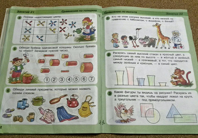 Дается сравнение предметов по длине, ширине и высоте. Ребенок получит представление о геометрических телах и формах, таких как квадрат, куб, овал, прямоугольник, цилиндр, конус, призма и пирамида. Каждой теме отведено по 5-6 заданий. Вполне достаточно для освоения и закрепления материала.