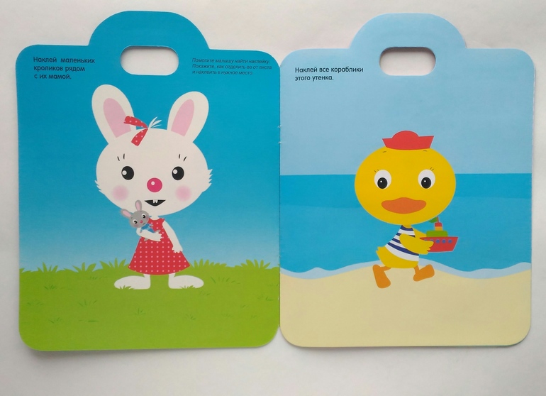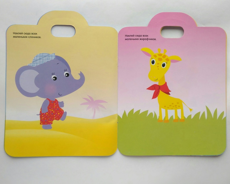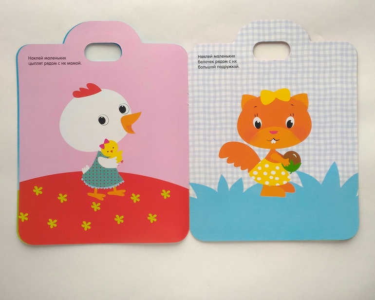 - простой "сюжет" на каждой странице: ровный фон, на нем крупный рисунок, необходимо приклеить наклейки, повторяющие изображение