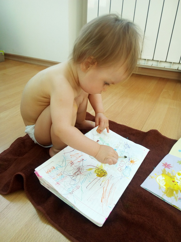 Если песок на детской площадке и манка ей очень нравятся,то с тестом и кинетическим песком она никак не хочет играть.Да и рисование тоже не вызывает у нее восторг,поэтому делаем это редко.Рисуем красками по рецепту,который я нашла здесь (спасибо Вам,мамы!).Делается за 2 минуты!И приобрела водные раскраски,тоже иногда рисуем.