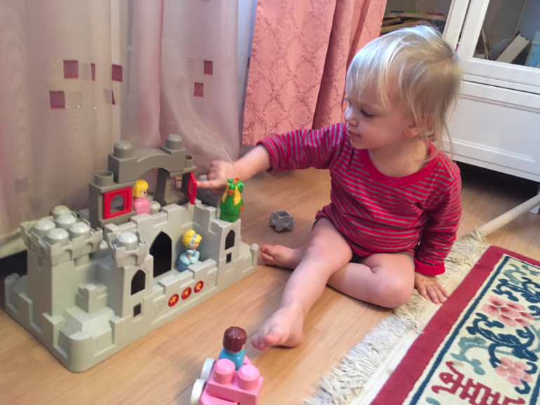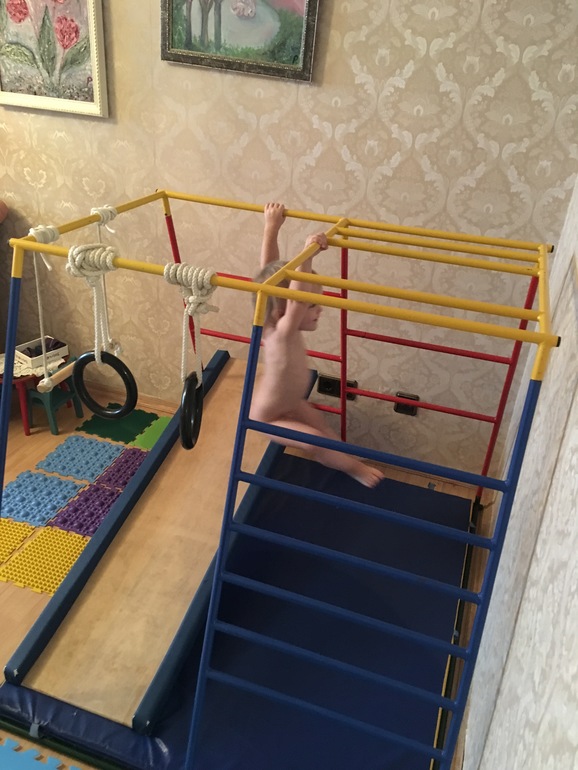 Активно развивается благодаря спорткомплексу, да и зарядке.Вот здесь у нас не совсем презентабельный вид, тем не менее пытаемся сделать упражнение "уголок" - удерживаем ножки под прямым углом. Очень нравится раскачиваться в таком положении и спрыгивать вниз. Игнорим кольца, пока не рискуем спускаться через проем в рукоходе, горка и лесенки по-прежнему в фаворе. Заметила также, что появилась потребность все время куда-то лезть, например на спинку дивана, поэтому РС ее отлично компенсирует. Учимся прыгать и перепрыгивать с визгом и хохотом. Особенно на фитболе. Подумываю о батуте, но как-то помню, что у старших пылился..