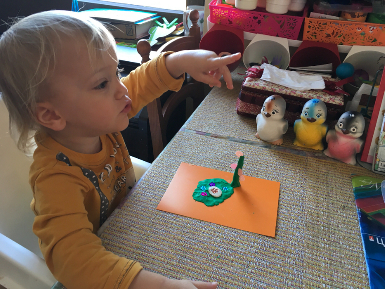 Раздал всем тарелочки, разложил. И снова работают маленькие пальчики, да и птиц заодно вспомнили)