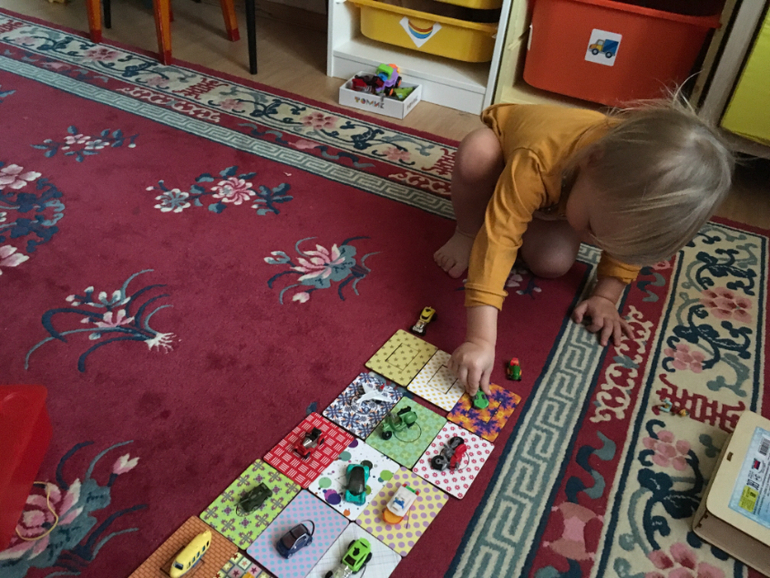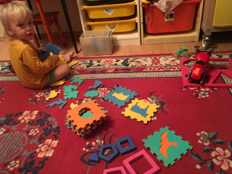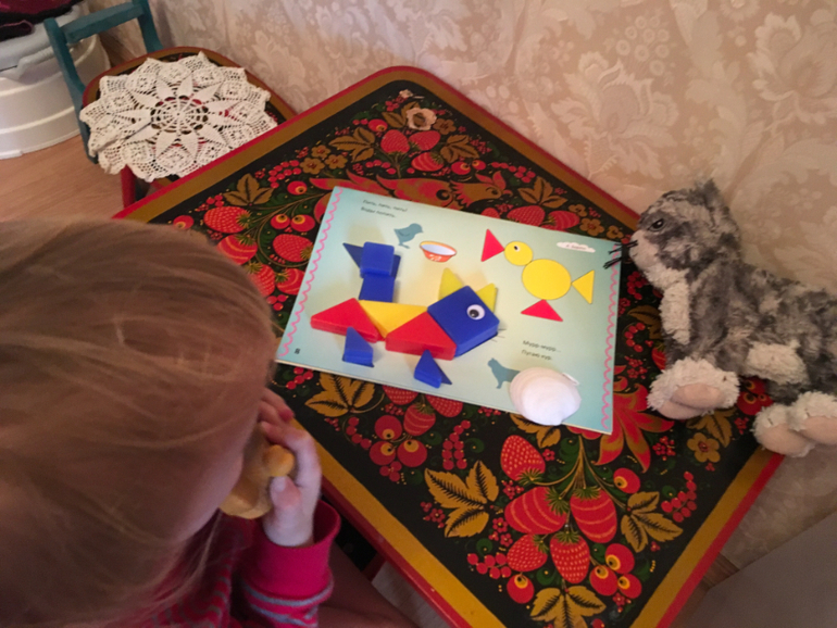 Вот видишь, какая красотень) ребёнок постарше должен укладывать фигурки и состыковывать узор. Вот даже мне сейчас с чёрными квадратами пришлось повозиться)