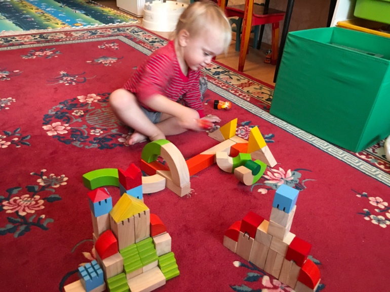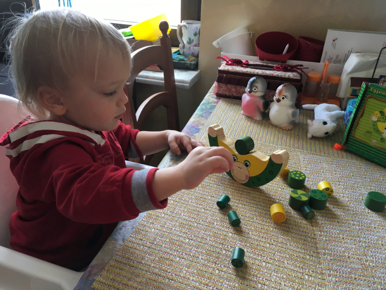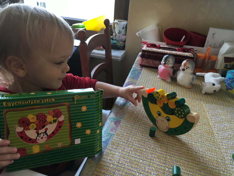 Достали старенький балансир. Оказался очень интересной и универсальной игрухой. Поиграли по правилам, посортировали по цветам и размерам, даже поконструировали немного.