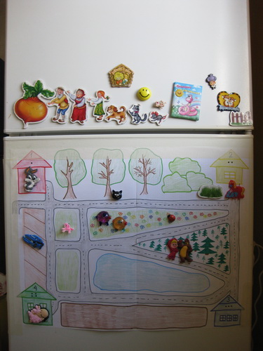 На нескольких листах белой бумаги нарисовала «Деревню» в упрощённом варианте: дорога, 4 дома разного цвета, парковка, поле (грядка), сад, лес, луг.