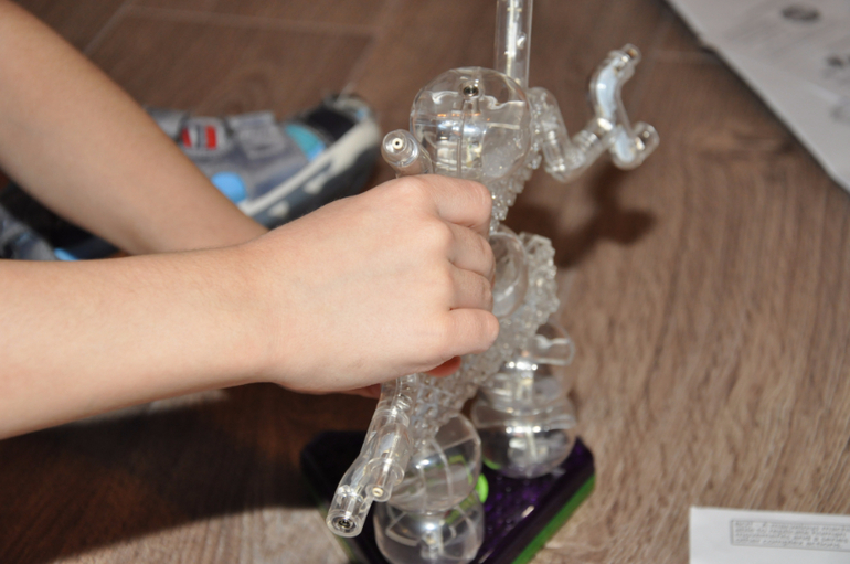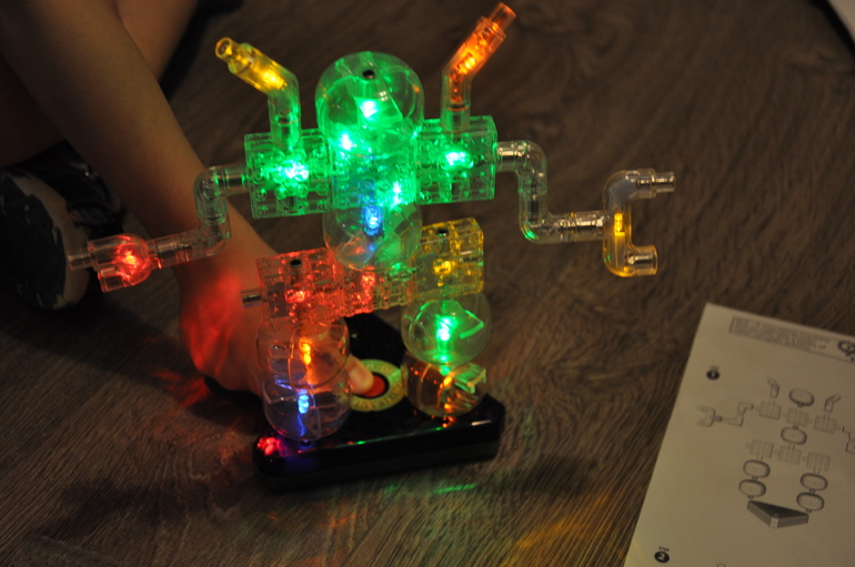 Новогодний подарок от папы с мамой, чтобы разнообразить леговское безумие))) Удалось, но не на долго)) Так как процесс сборки для Артура пока интереснее игры с полученным результатом, а детали этого конструктора все "на одно лицо" прозрачные, то увлечься им надолго пока не удается.Думаю, через годик, устав от цветового разнообразия, интерес к нему должен все же проснуться))