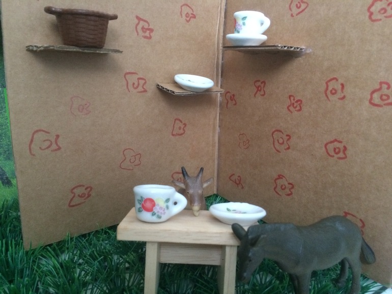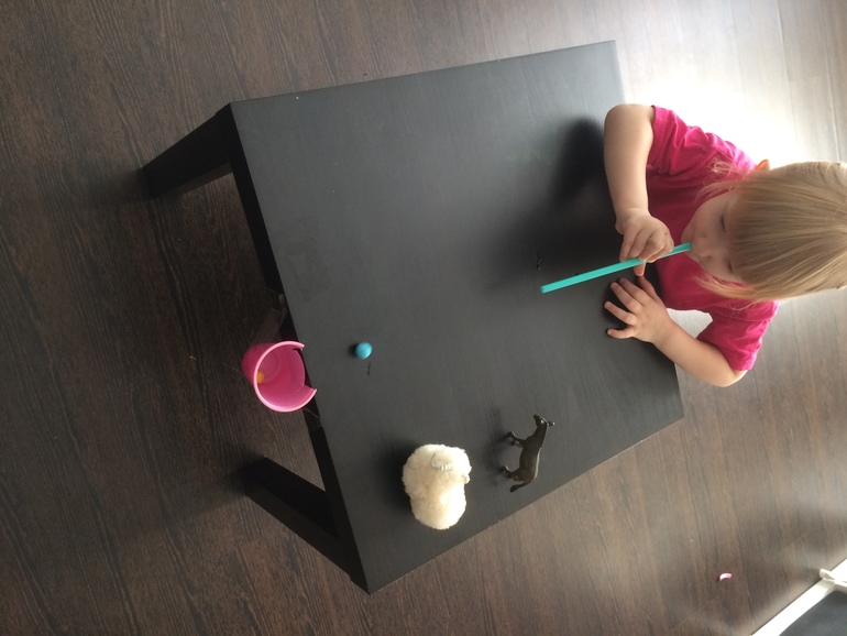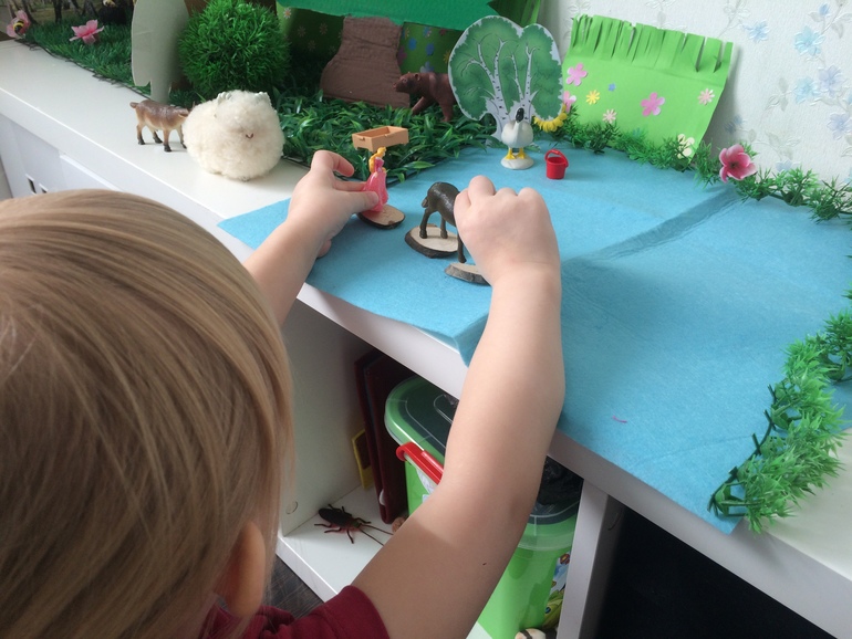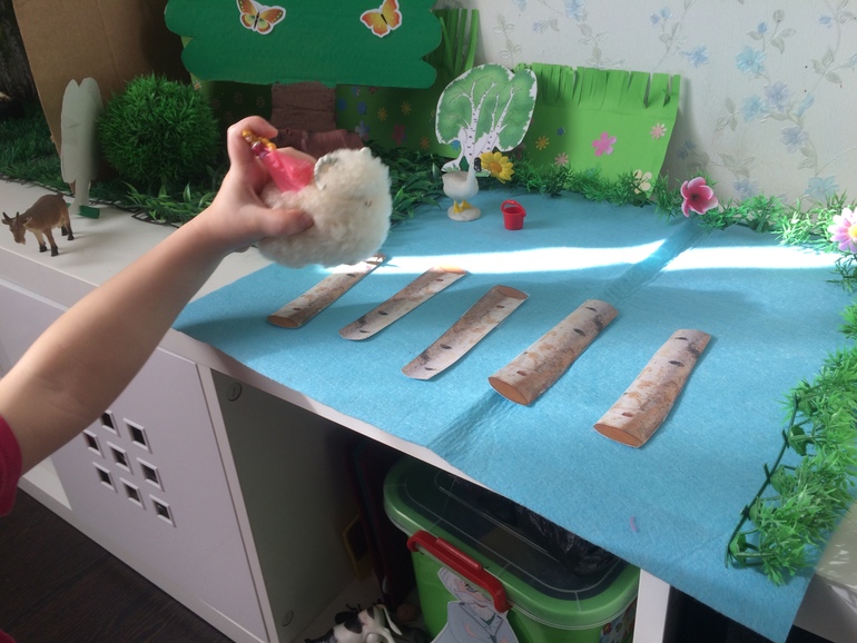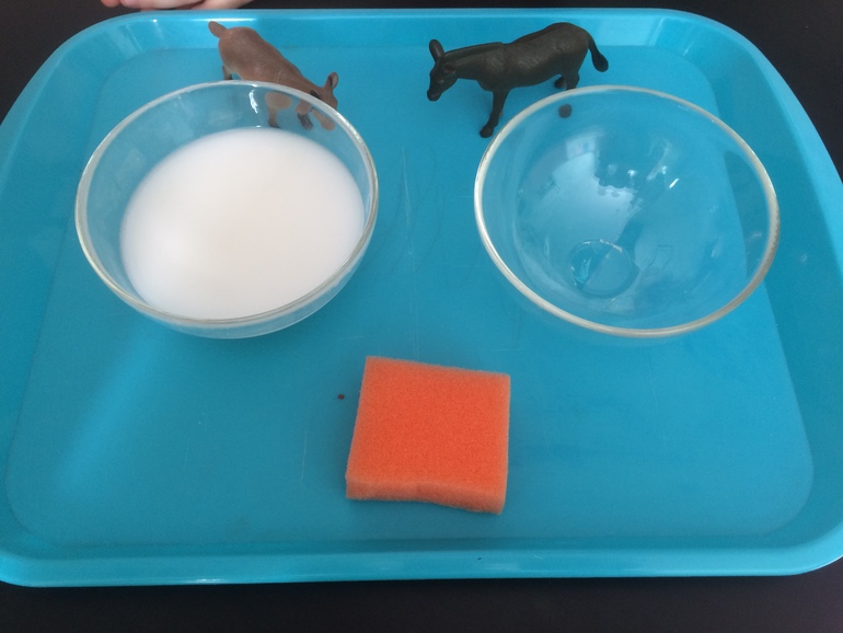 2 Встреча с козой- помогаем козочке перелить молочко с помощью губки ( вода крашеная гуашью).Начали с губки, но затем дочка принесла ложечки, воронку, бутылочки и наша игра затянулась...