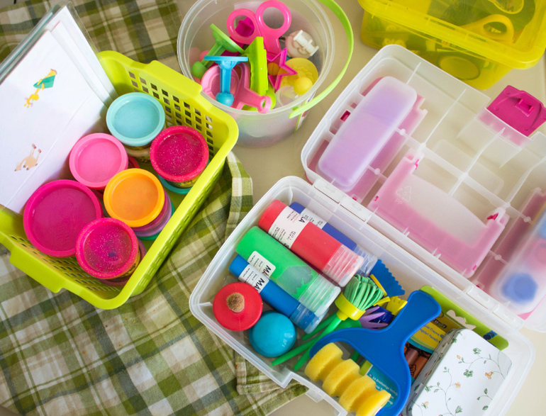 10. Наша кучка баночек Play-doh и штампы к ним из разных наборов. Для малышей идеальная масса для лепки - мягкая, упругая, нелипкая, убирать легко, невкусная). Минусы - на воздухе засыхает, может и в баночке засохнуть (если долго лежит), цвета не классические радужные, в наборах в основном оттенки.