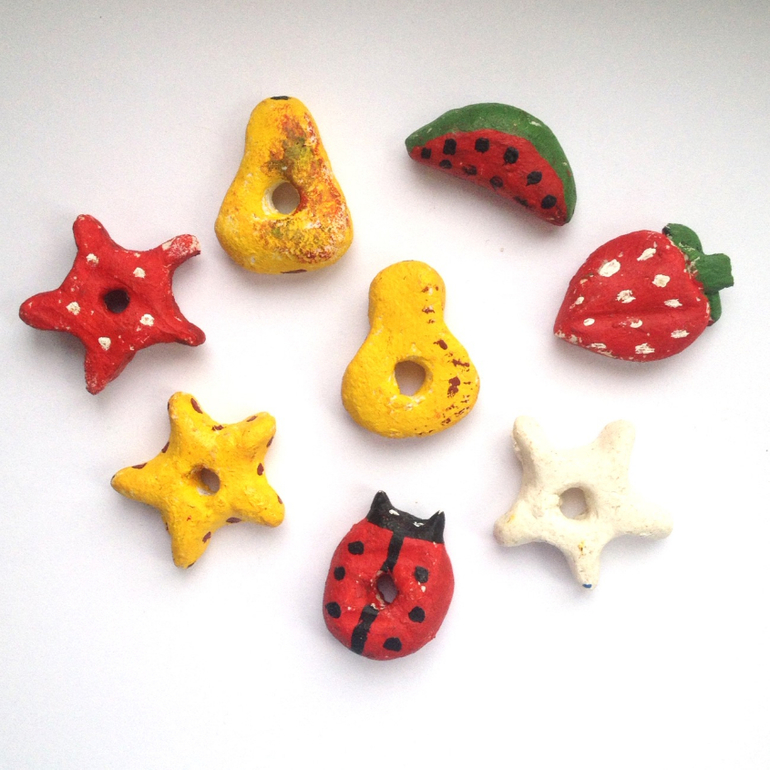 Эти фигурки с дырками, их можно нанизывать на веревочку.