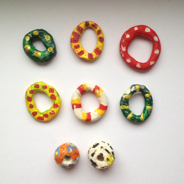 Колечки и бусинки (Бусинок много, фоткать все не стала). Тоже для шнуровки. Бусинки можно дать раскрасить ребенку, на его вкус. Мы использовали контур по стеклу, он оставляет выпуклые рисунки