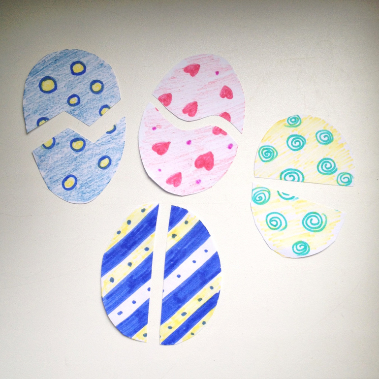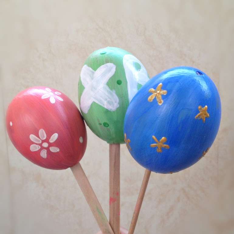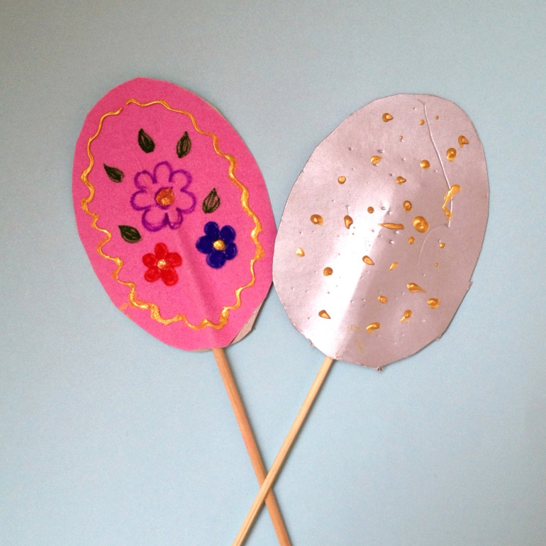 Еще одни яички на палочках. Дети сами обводили картонные заготовки, вырезали две половинки, склеивали вместе с палочкой. Я Тимоше помогала, а Ваня делал все сам.