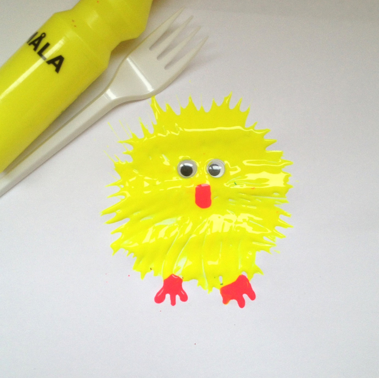 Цыпленок, нарисованный вилкой. Берем жидкую краску и размазываем вилкой. Получается очень пушистенько! Мне самой понравилось делать.