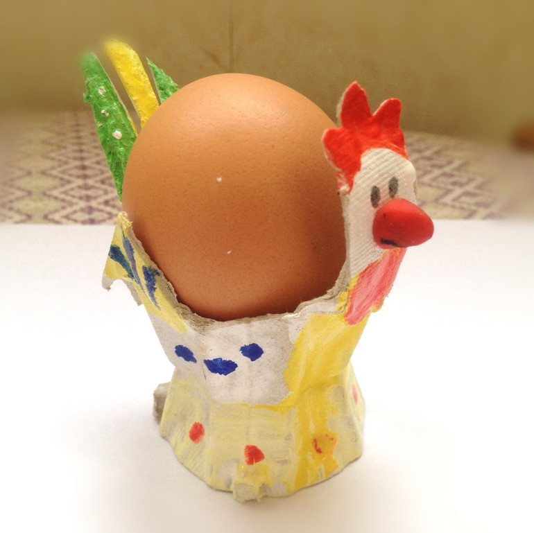Из коробочки для яиц (вернее ячейки от нее), сделали петушка. Это подставка для яичка. Ваня раскрашивал сам.