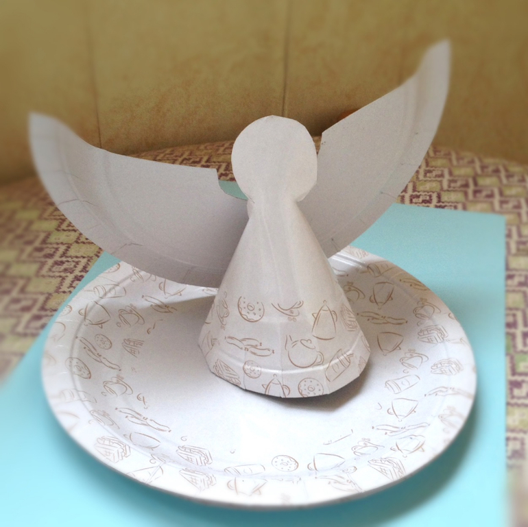 Из бумажной тарелки сделали ангелочка. Делается очень просто.