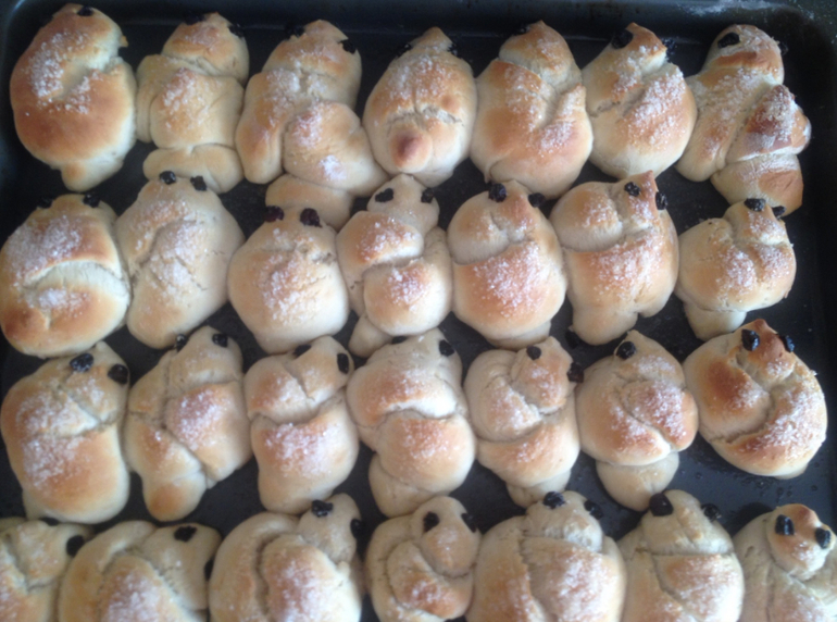 И наконец все вместе испекли постных жаворонков с глазками-изюминками. Много!