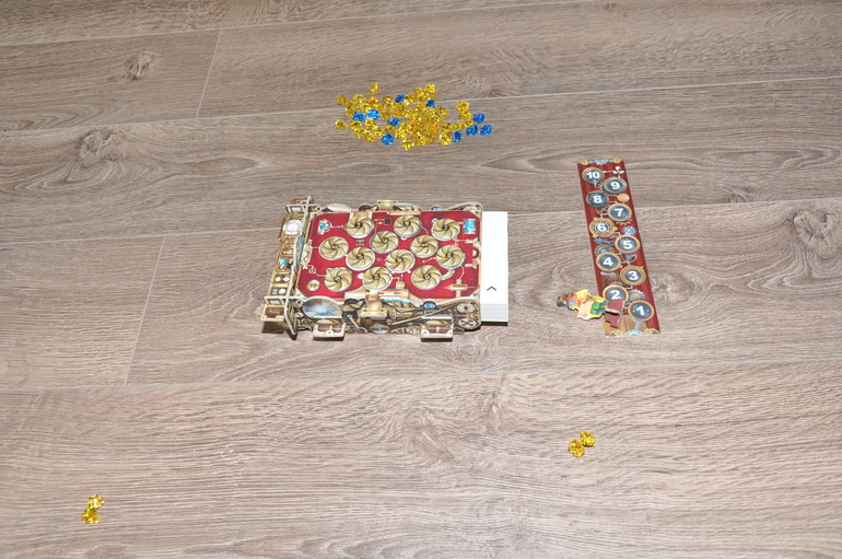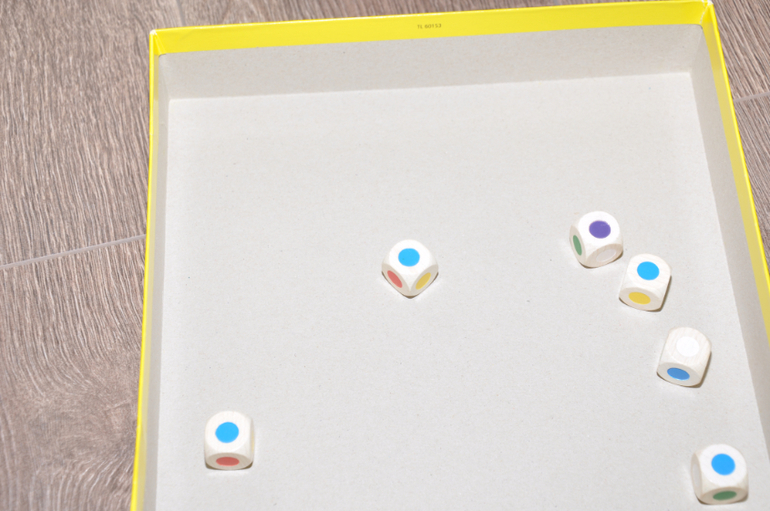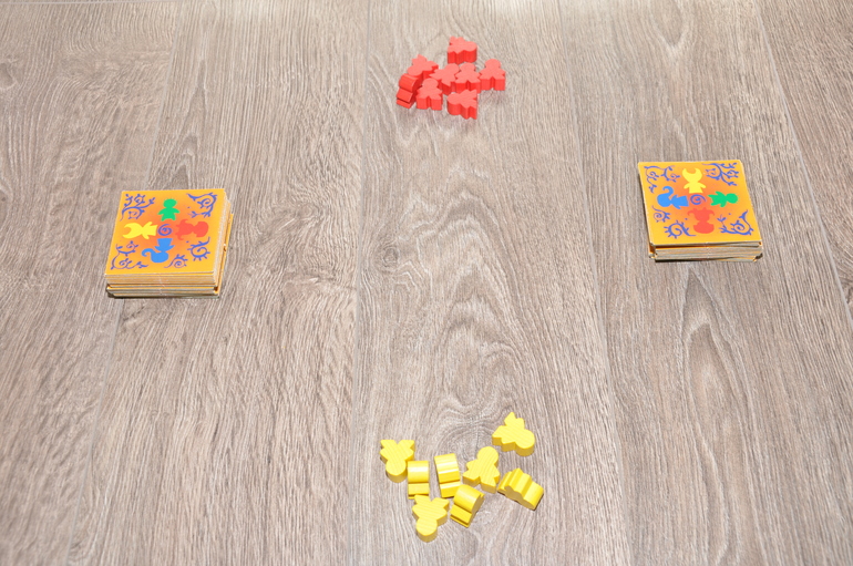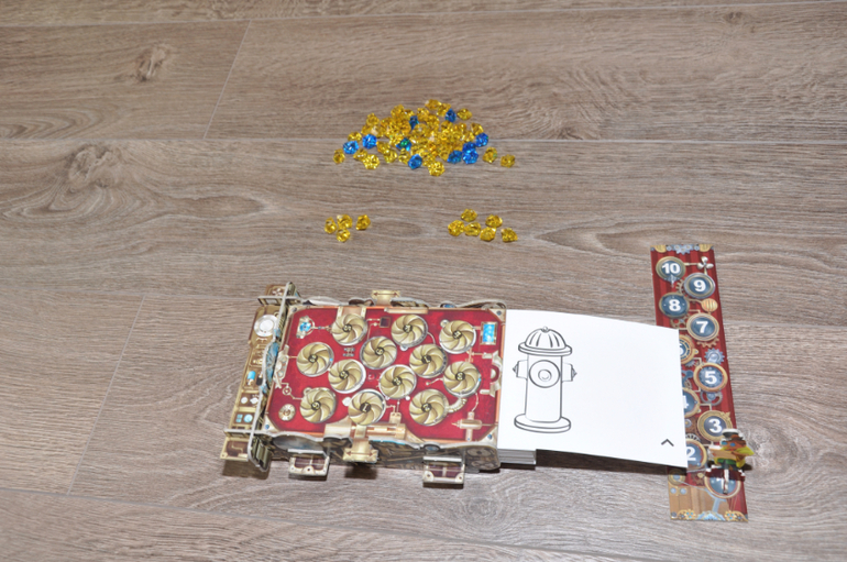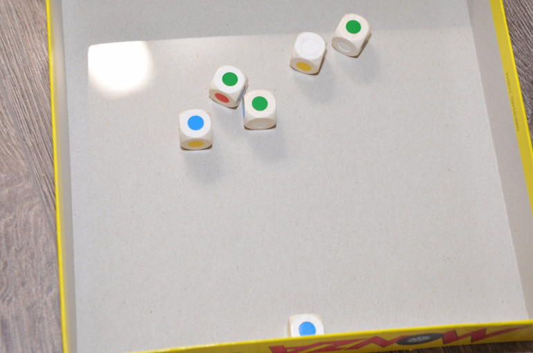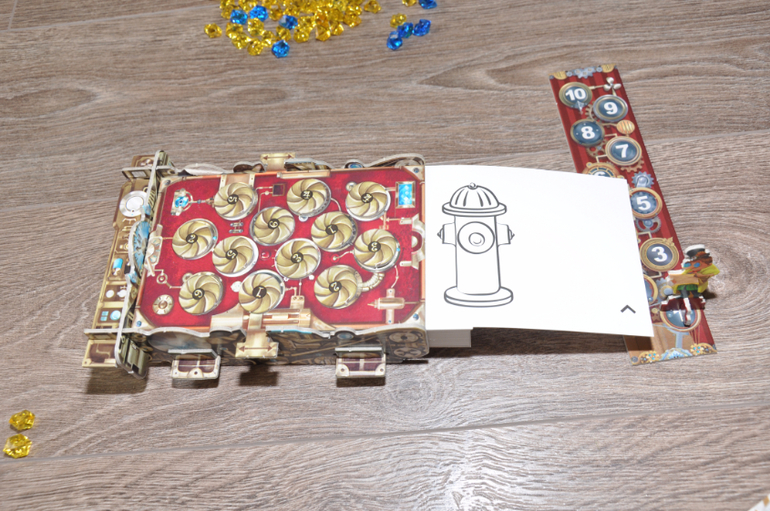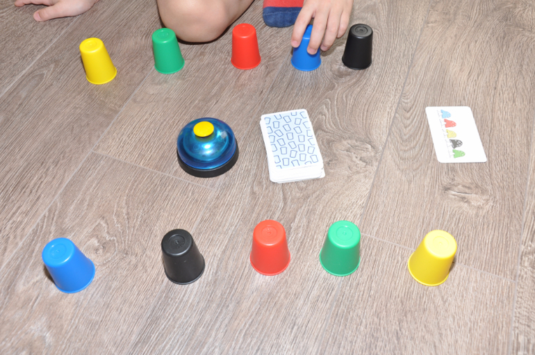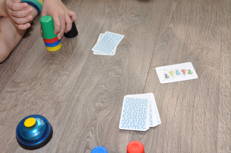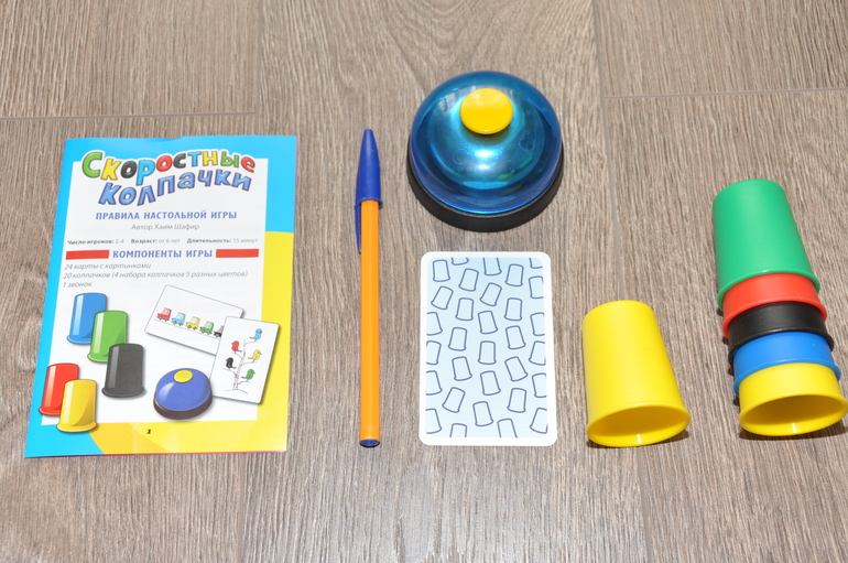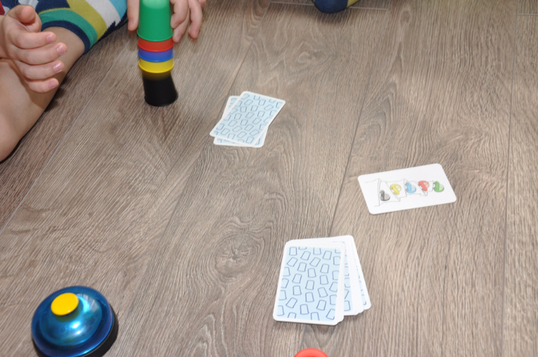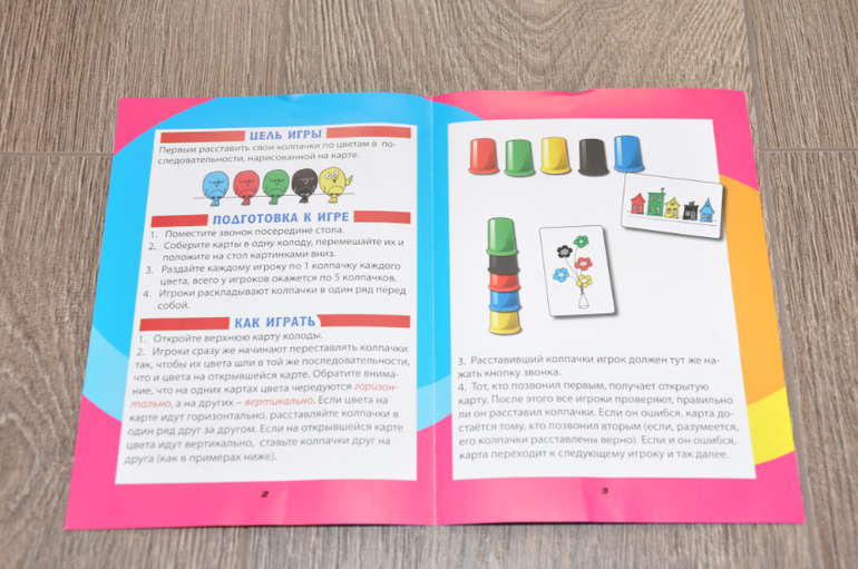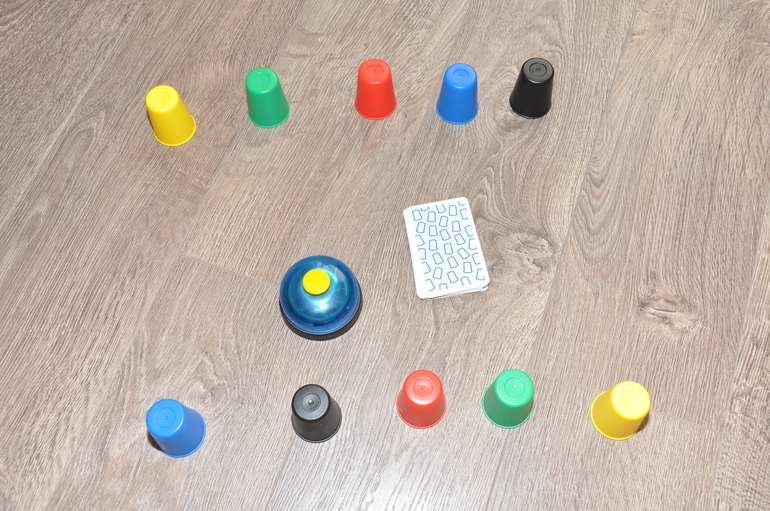 Правила игры, если коротко, состоят в том, чтобы составить горизонтальный или вертикальный ряд из колпачков в точности в той последовательности, которая изображена на открытой карточке.Тот, кто сделает это первым, нажимает на звонок и, если ряд составлен верно, забирает себе карточку.