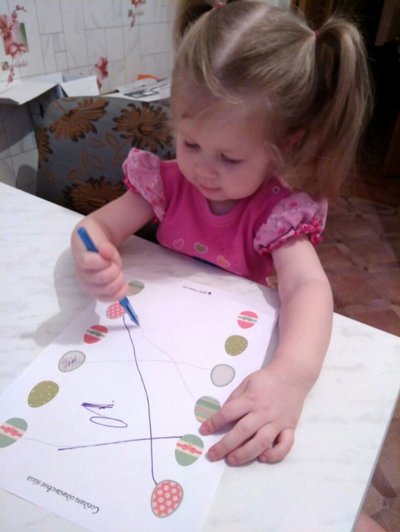 На «Ура» пошла игра с поиском яиц по дому. Решила порадовать малышку веселым традиционным западным развлечением, рассказала историю про пасхального кролика (в его роли выступал наш любимый Робби из «Первых эмоций»), который спрятал ранним утром разноцветные яйца в квартире. Дочка с огромной радостью и веселыми визгами собирала яйца в корзинку. Играли в пасхальное мемори, искали парные яйца, проходили лабиринты и т.д.