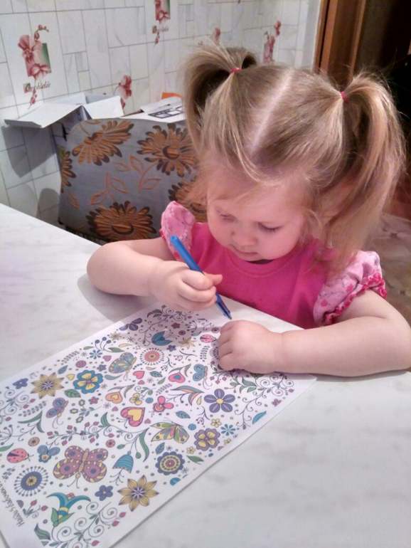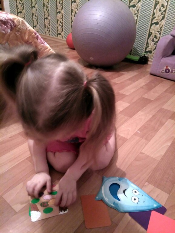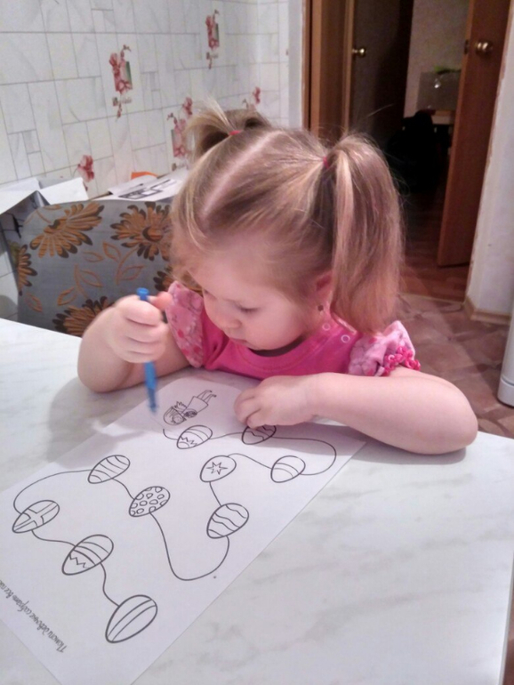 В историю праздника я в этом году решила не углубляться, познакомлю малышку с ней в следующем году. Больше рассказывала о традициях и символах. С огромным удовольствием Слава наблюдала процесс покраски яиц и оказывала посильную помощь… Пока крашеные яйца сохли, дочь поиграла с трафаретами из «Творчества с пеленок» и подбирала разные карточки-оттенки для праздничных яиц…