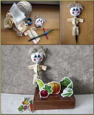 Самодельные игрушкиВ одной из книжек дочка загляделась на огородное пугало, попросила сделать ей для игр. Вот что получилось из подручного материала: