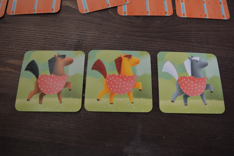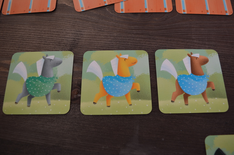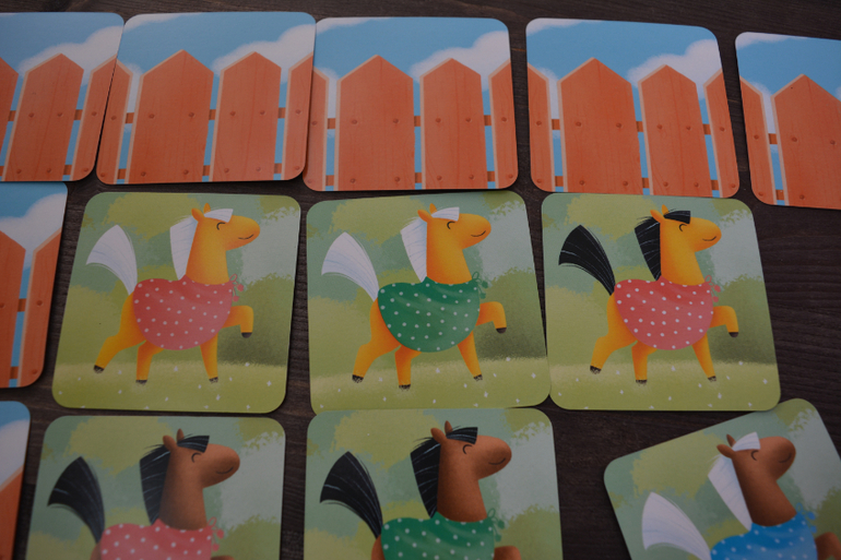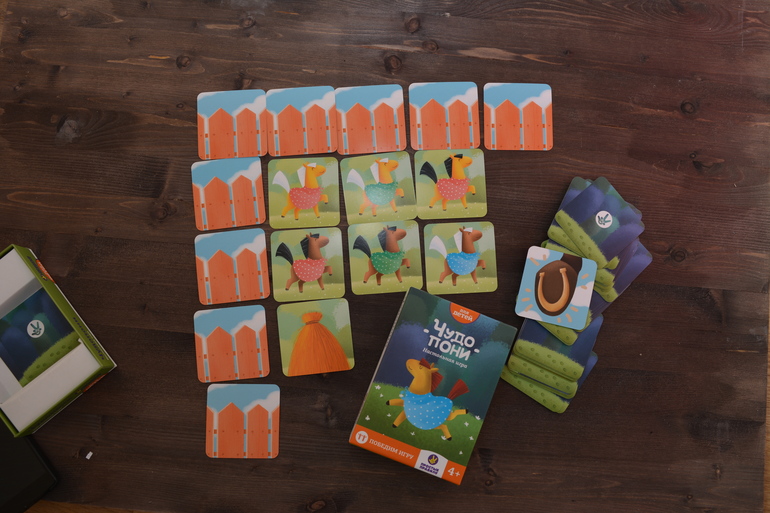 Чудопони подойдет детями от 4 до 7 лет. Владу в августе будет 5, с механикой освоился быстро. Хотя не понимал границы забора. По правилам забор должен быть 7х7, внутри него выкладываются пони и сено (квадрат 5х5). Но в процессе игры Владу сложно было оценить, куда, например, класть пони? Мне нужно было ему объяснять, смотри, это будет уже шестая карточка, сюда уже нельзя класть пони, давай сюда, здесь пока есть место.